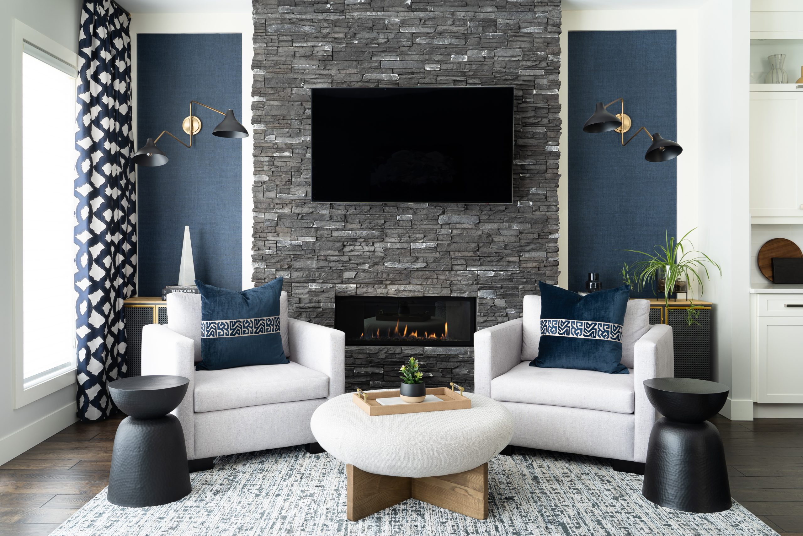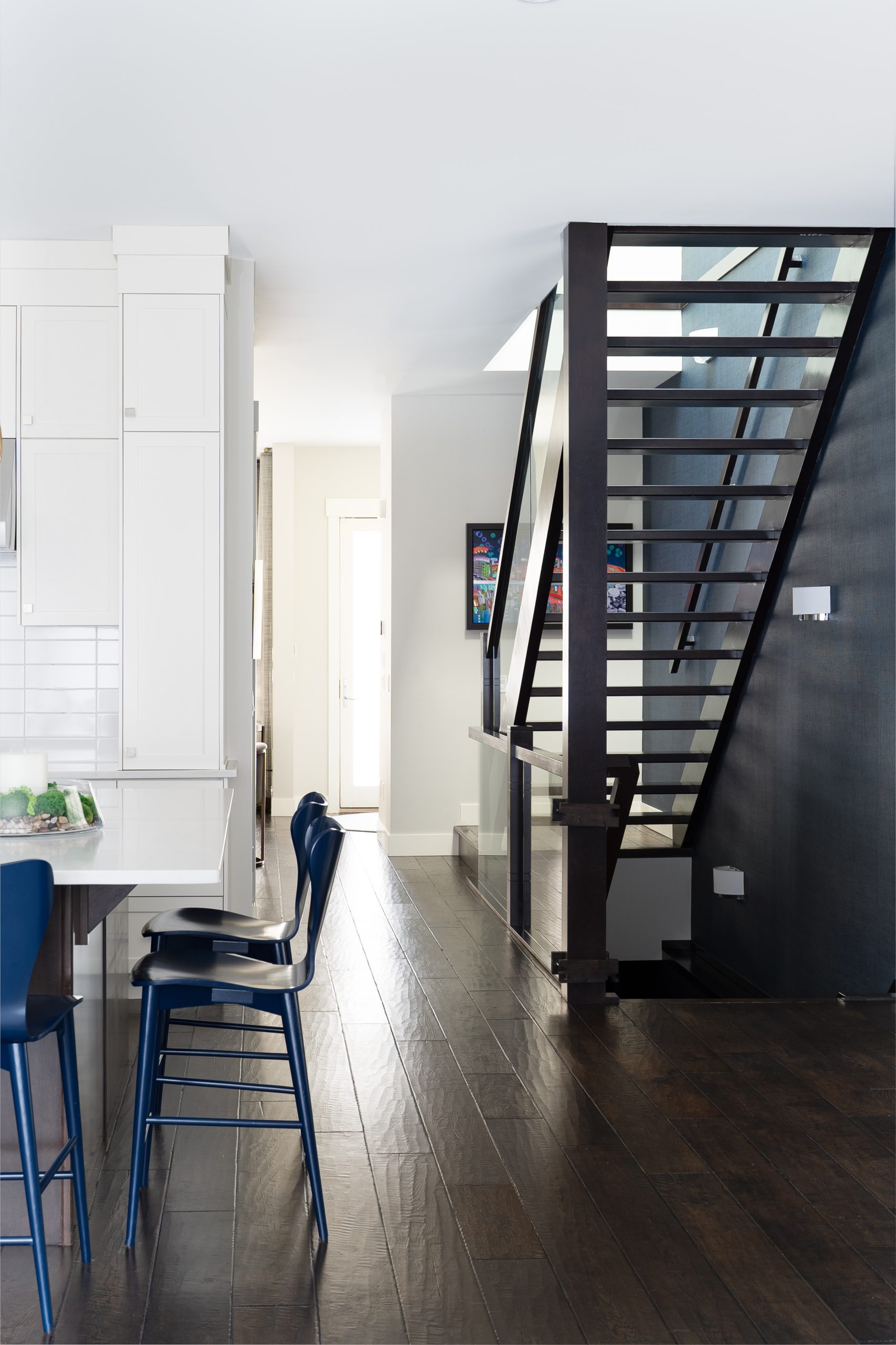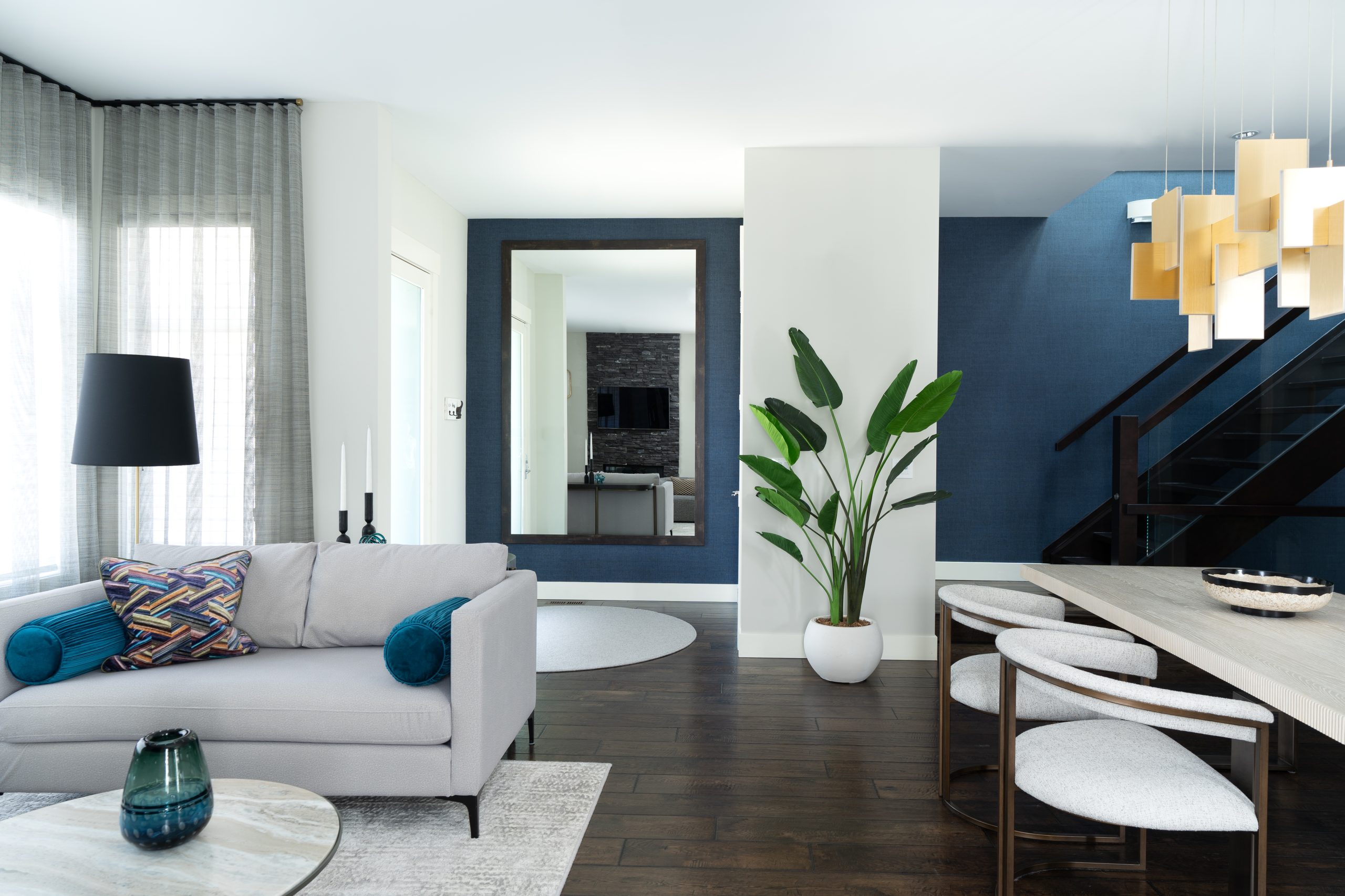 • We created continuity between the front of the main floor and the back. We used an indigo woven wallpaper on the common wall that runs along the entire main floor and up to the second. Blue is the client’s favourite colour so we tried to incorporate it throughout.