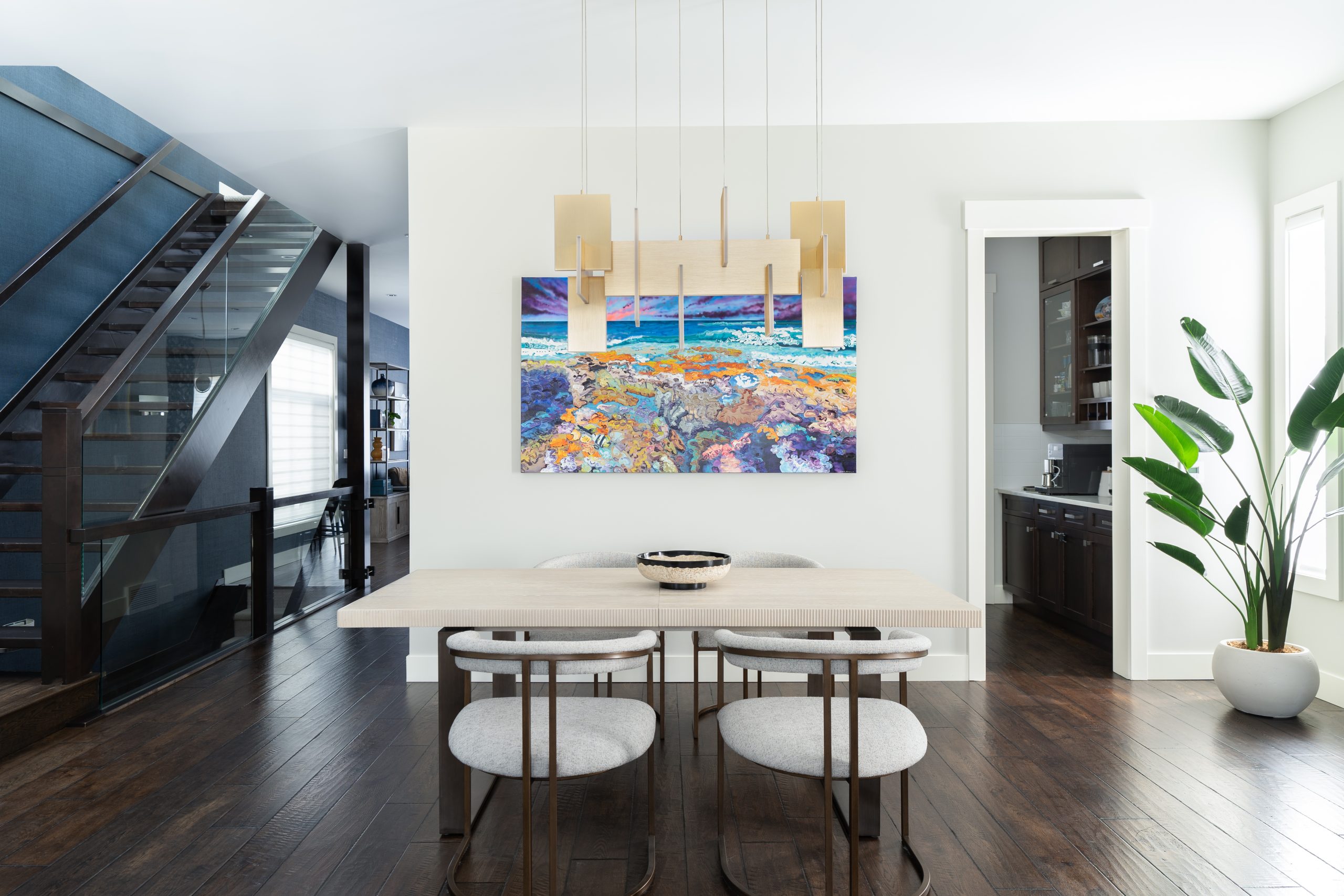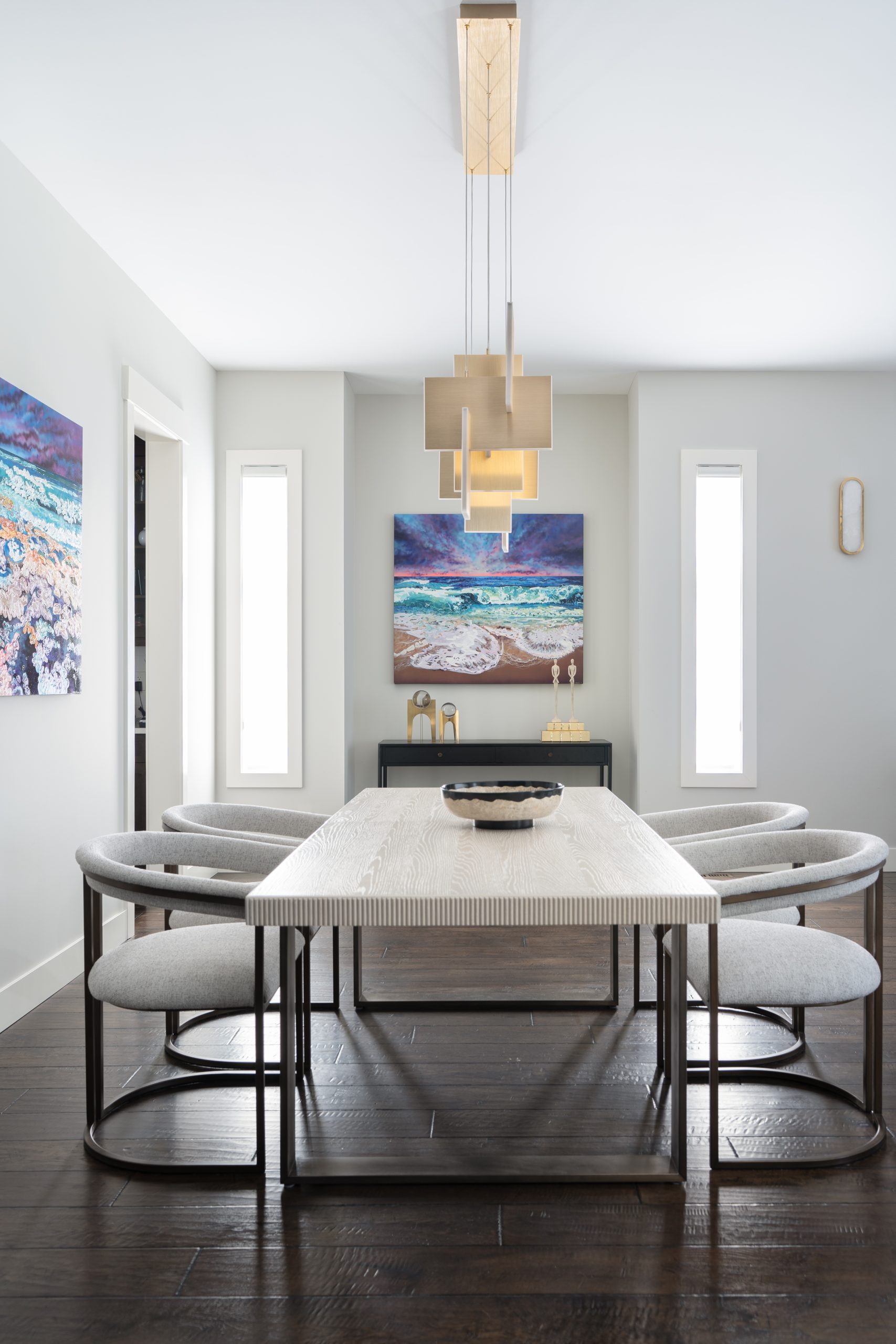 • At the front of the house we kept the palette very neutral to showcase the client’s gorgeous colourful art. We used a neutral dining table with a modern gold fixture that really compliments the art well.