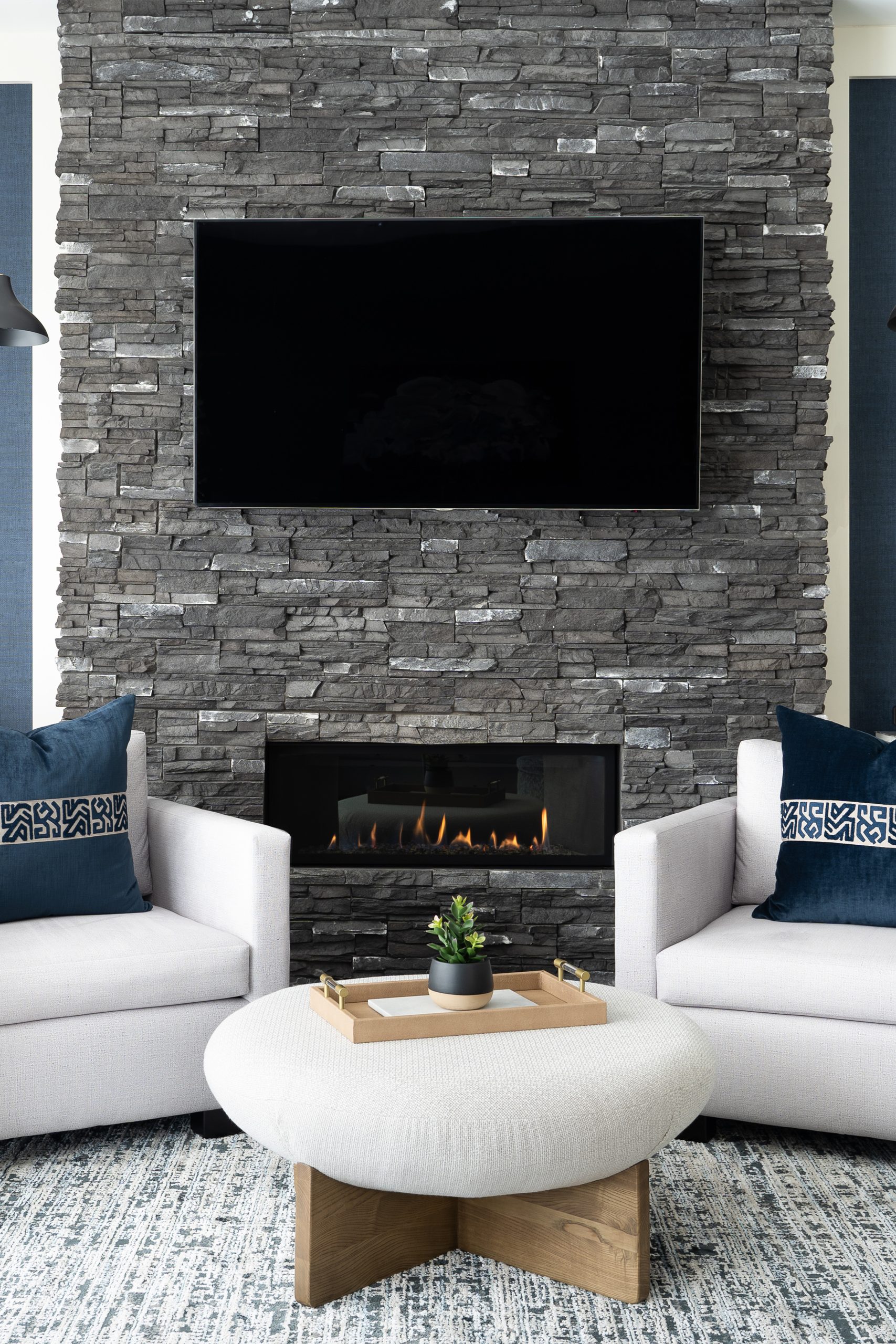 • In the family room we placed a very large, deep custom sectional upholstered in a family friendly fabric to provide seating for the entire family and Winter the dog! The deep wide chairs flanking the fireplace allow for cuddles with the kids and an ottoman for stretching out. By separating these two areas with carpets, we created a walking space to access the sliding doors out to the backyard.