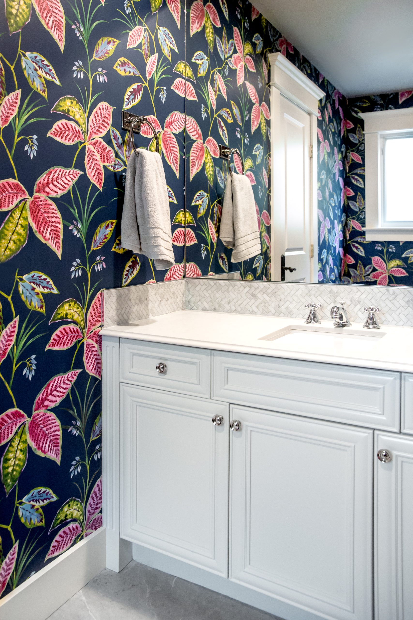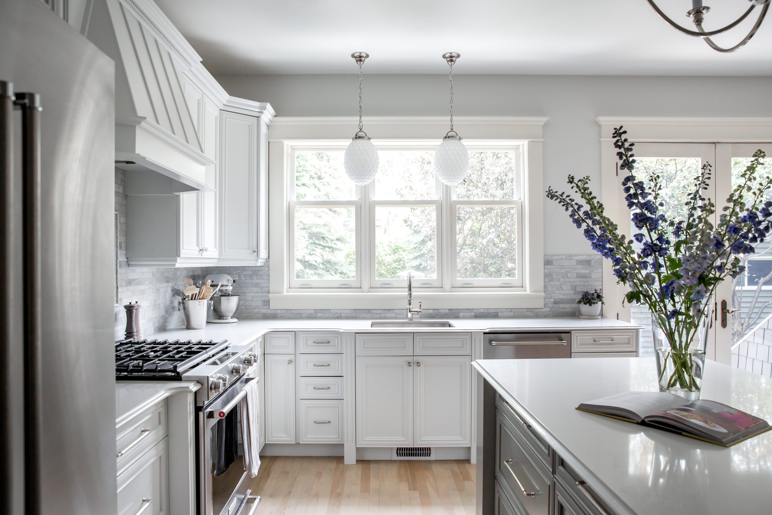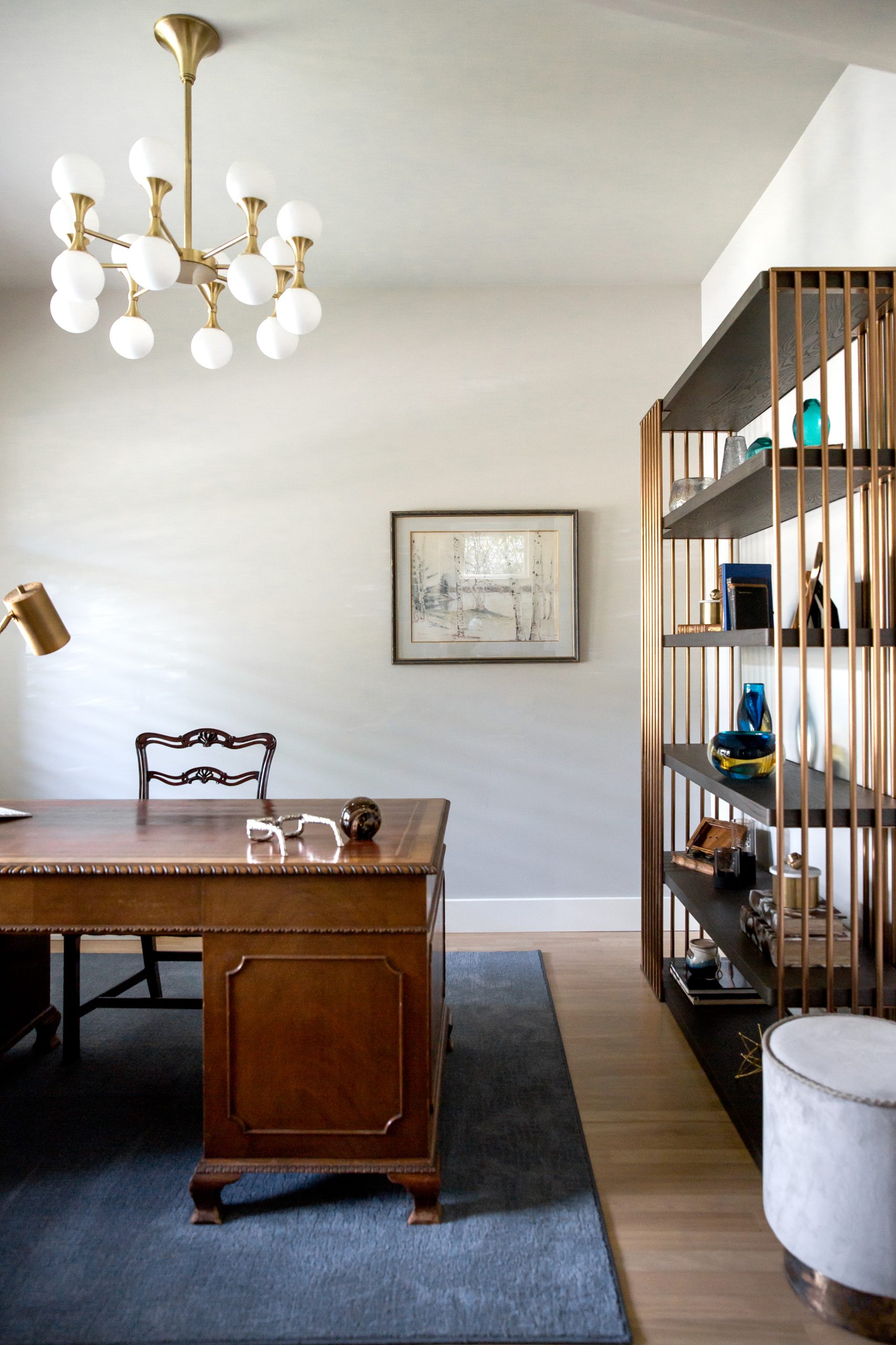 This heritage home needed a refresh to lighten and update the main floor and basement. It was dark and dated and the new owners wanted to create a bright and inviting space. We started in the kitchen by painting the existing cabinets, installing new marble backsplash and countertops, plus adding cabinet inserts and lighting. We repeated the same finishes in the family room to provide a cohesive look between these two spaces. This client wanted to use their existing heirloom dining table and carpet, so we created a dramatic space with indigo grass cloth wall covering and custom silk drapes. The new modern lighting juxtaposed against the antique furnishings added an unexpected element.