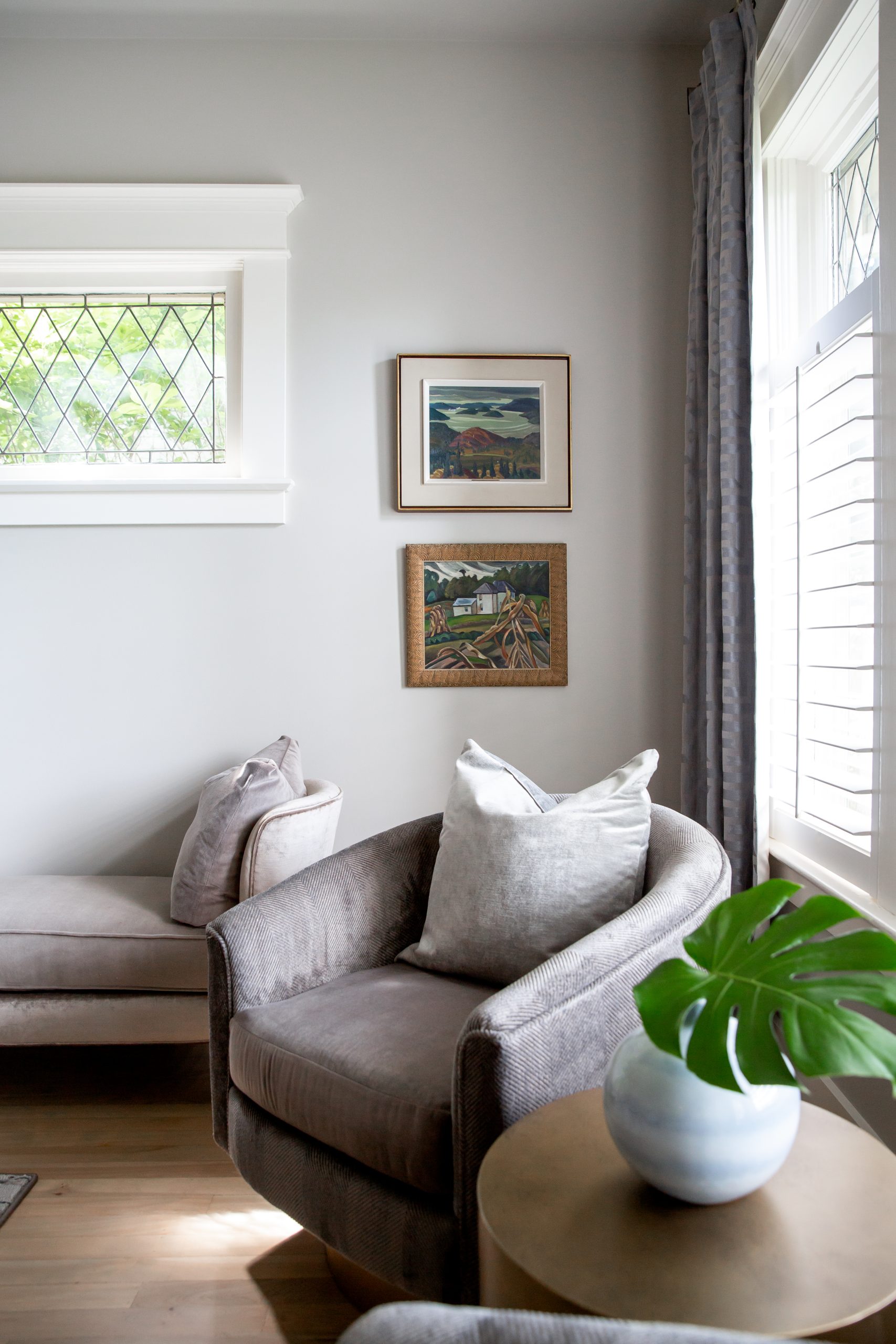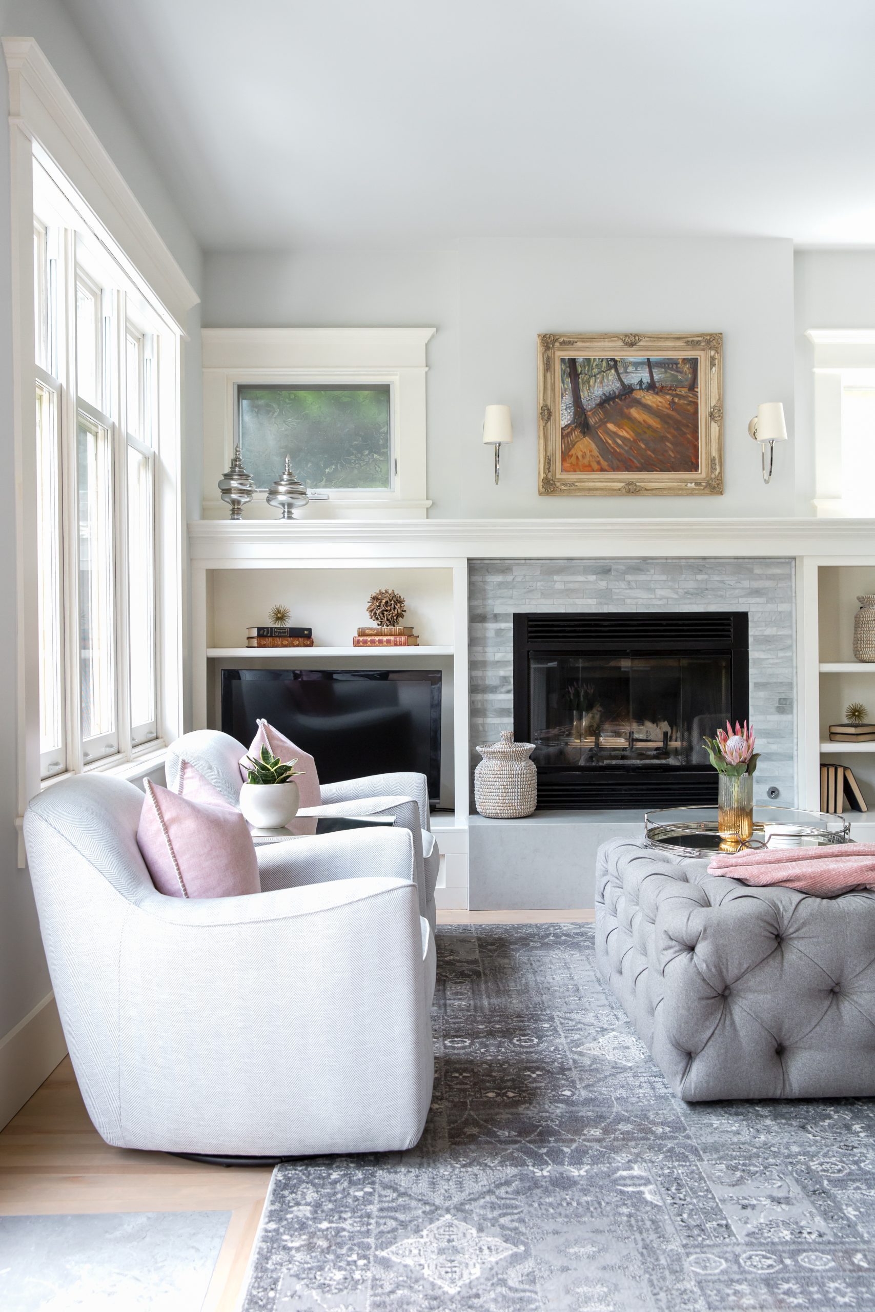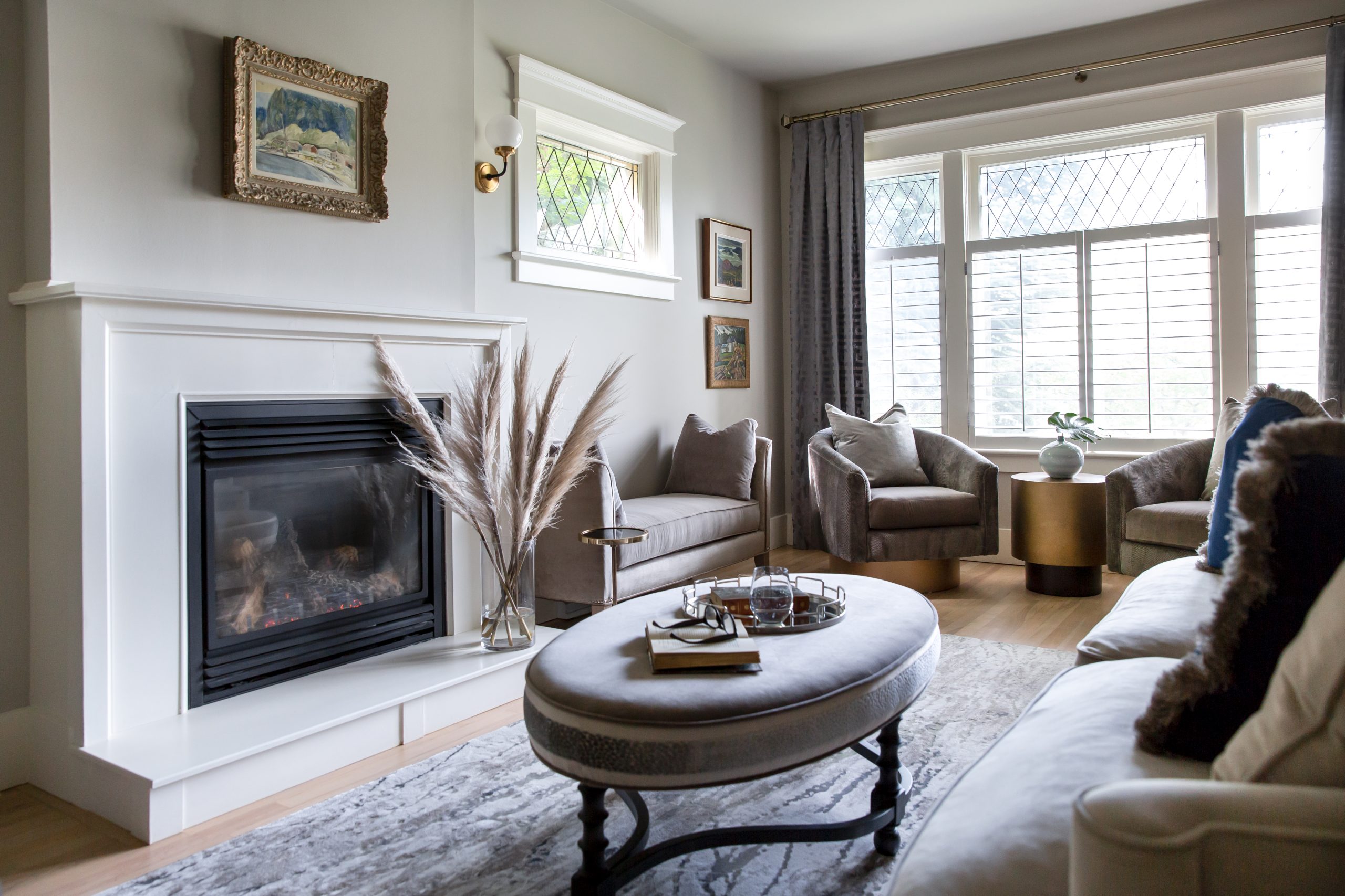 Elegant custom furnishings created a cohesive look in the formal living room and the same modern lighting was repeated in the wall scones. The original Emily Carr painting took center stage over the fireplace. The custom carpet runner in the front entry invites guests to access the front closet in this otherwise tiny space. The basement now has an oversized sectional for TV watching and lounging and we created a games area, perfect for late-night dining and playing cards.