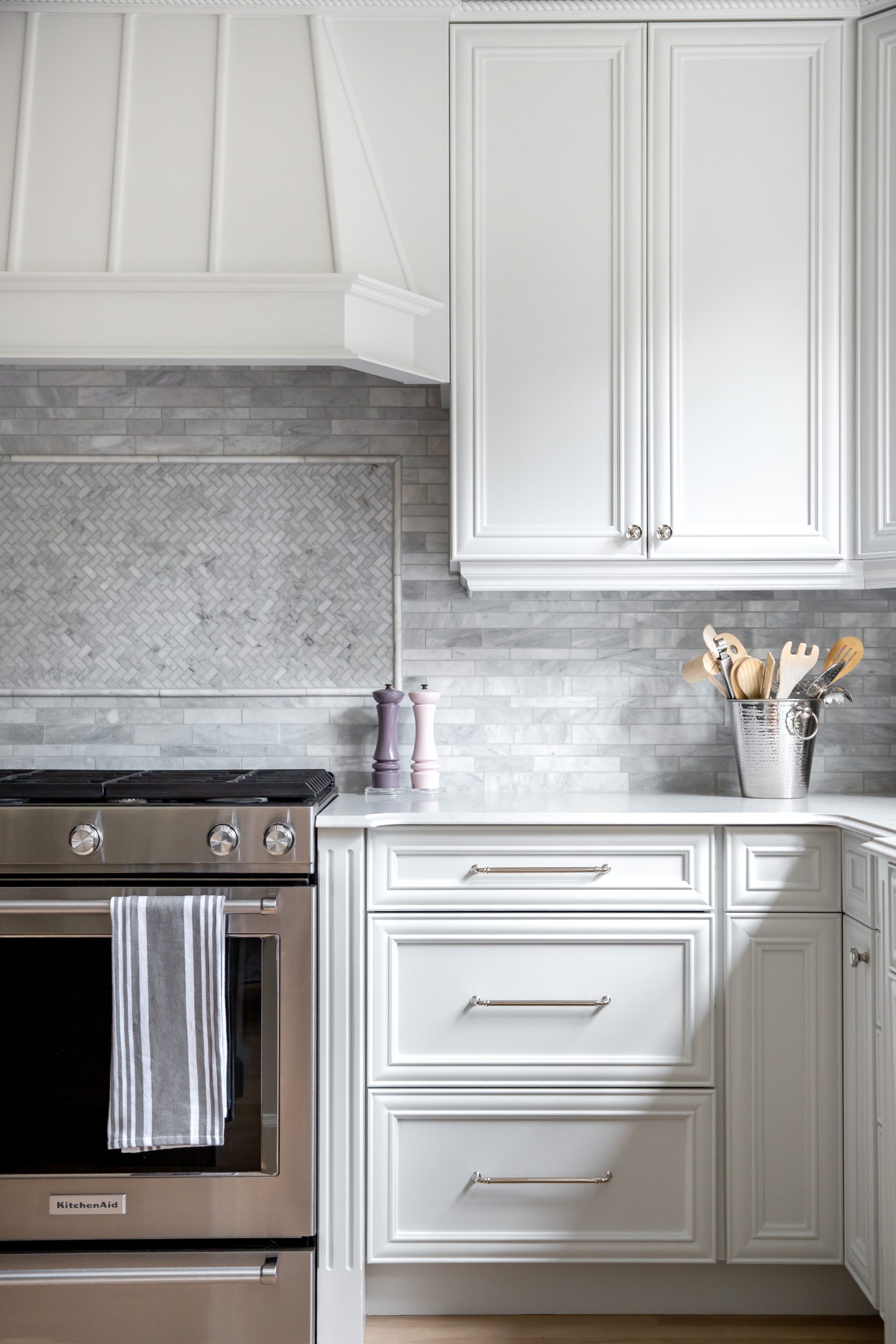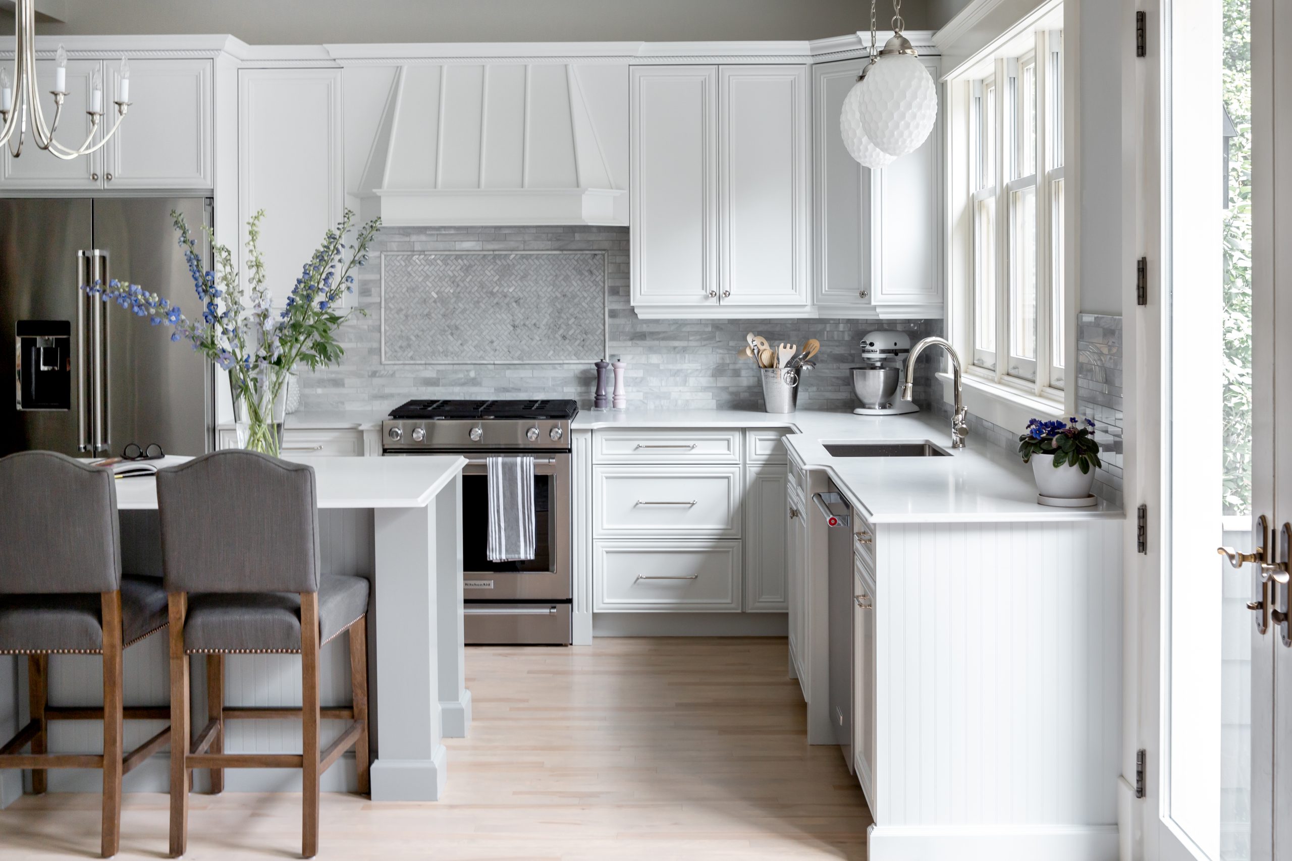 • Refinishing the main floor saved valuable resources and allowed for splurges on marble in the kitchen backsplash and fireplace surround.