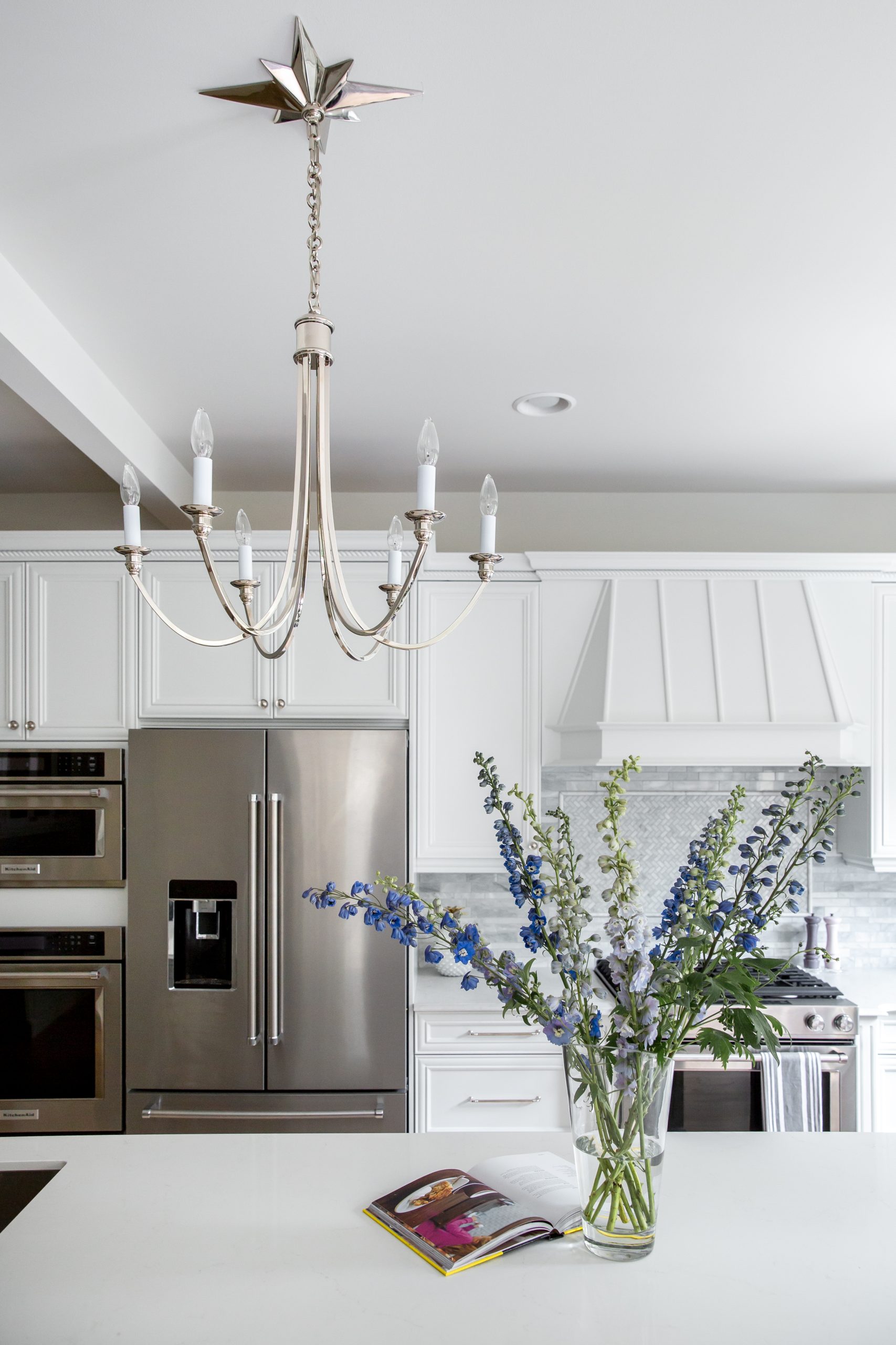 • We painted out the cabinets rather than replacing them and upgraded black granite countertops to a marble look quartz. Stunning polished nickel and glass fixtures elevate the kitchen.