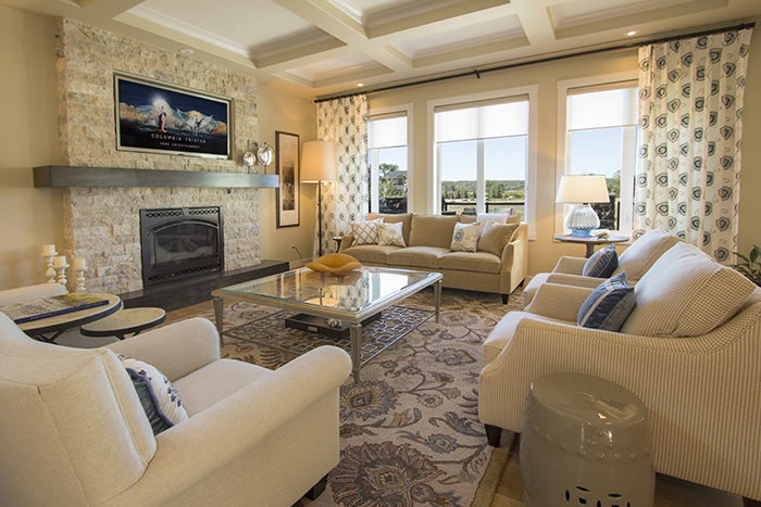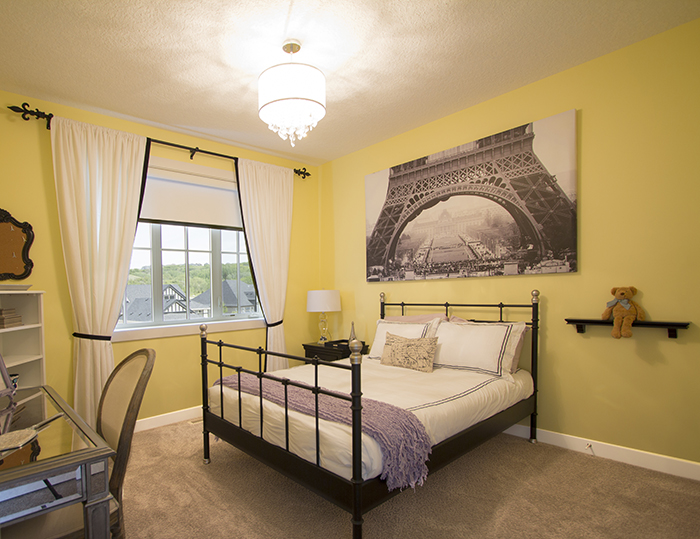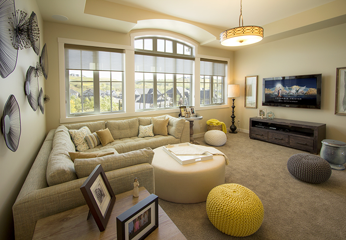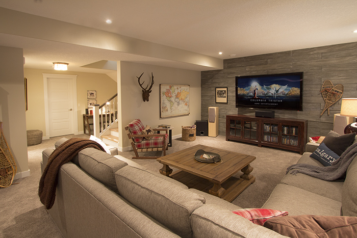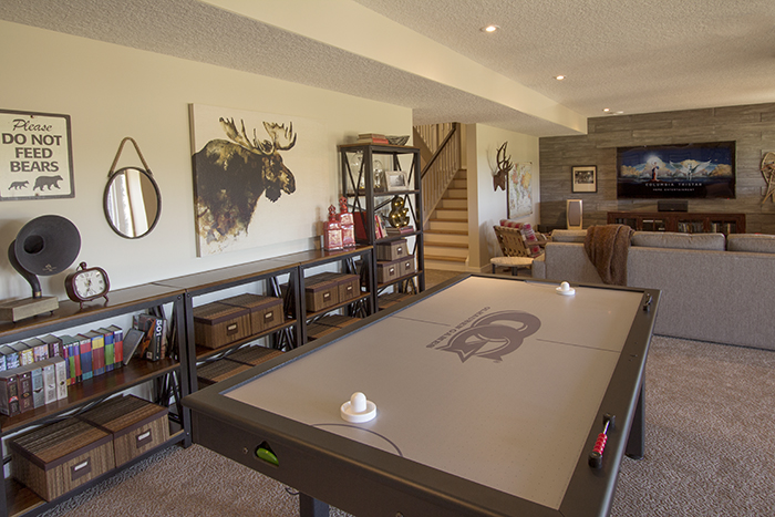 The owners wanted to make it feel like home for each member of the family so everyone provided input into what their dream home would look like. Each of the children had their own distinct design style so their bedrooms were decorated to suit their taste. We added a custom oversized sectional in the bonus room along with family-friendly upholstered ottomans to provide space for the kids to hang with friends and watch movies. The main floor was decorated using a warm and inviting colour palette with custom drapes and family-friendly custom furniture. The basement was designed as the ultimate entertainment space with custom furnishings, a reclaimed wood wall and accessories.