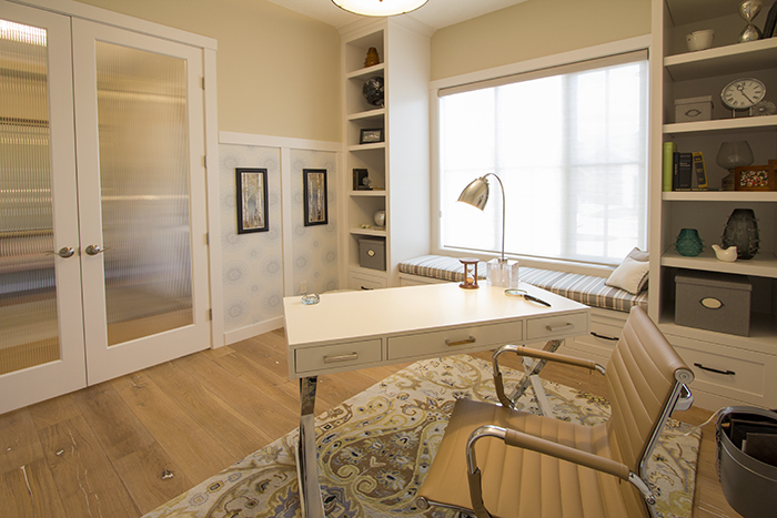 • We created a cozy office space for Mom using wallpaper, a custom bench seat, and custom area carpet along with additional storage and display built in.