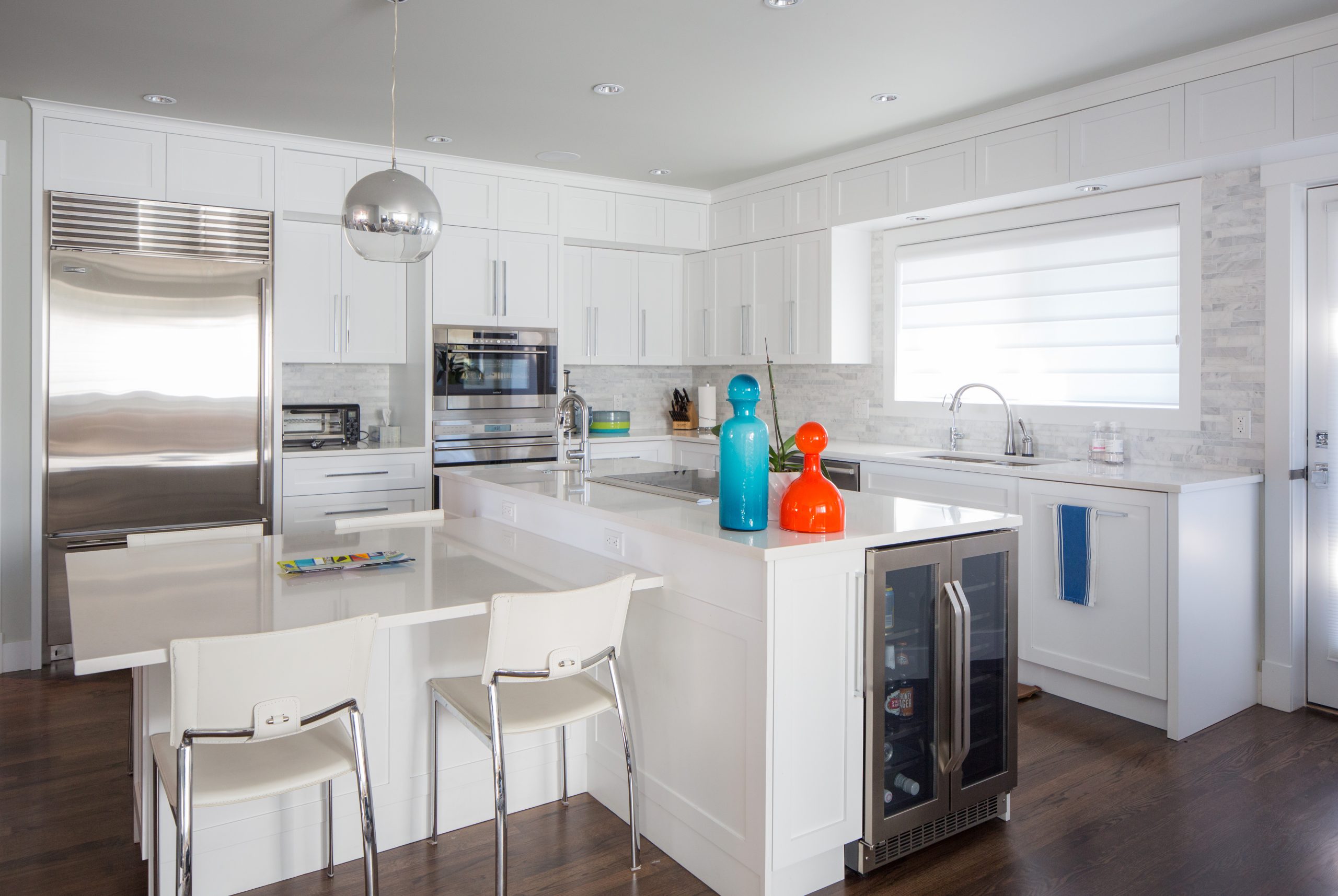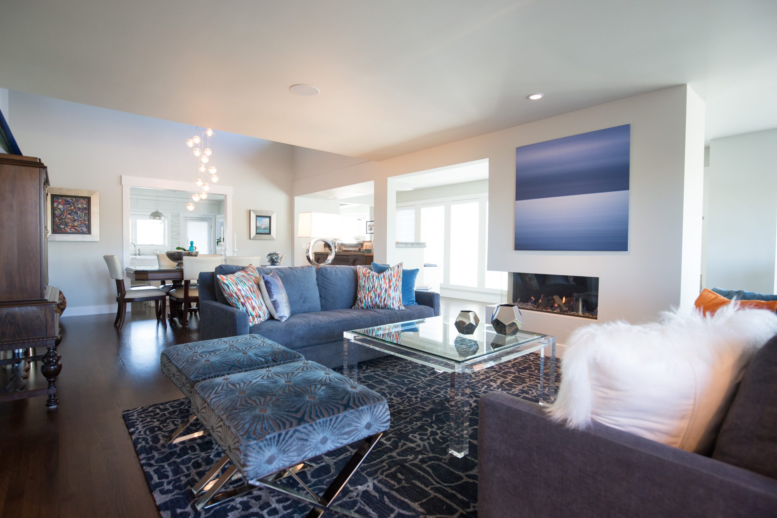 • We added custom window coverings, furnishings, and a bespoke Bocci chandelier in the dining room, which is open to the second floor providing a dramatic statement in this modern home.