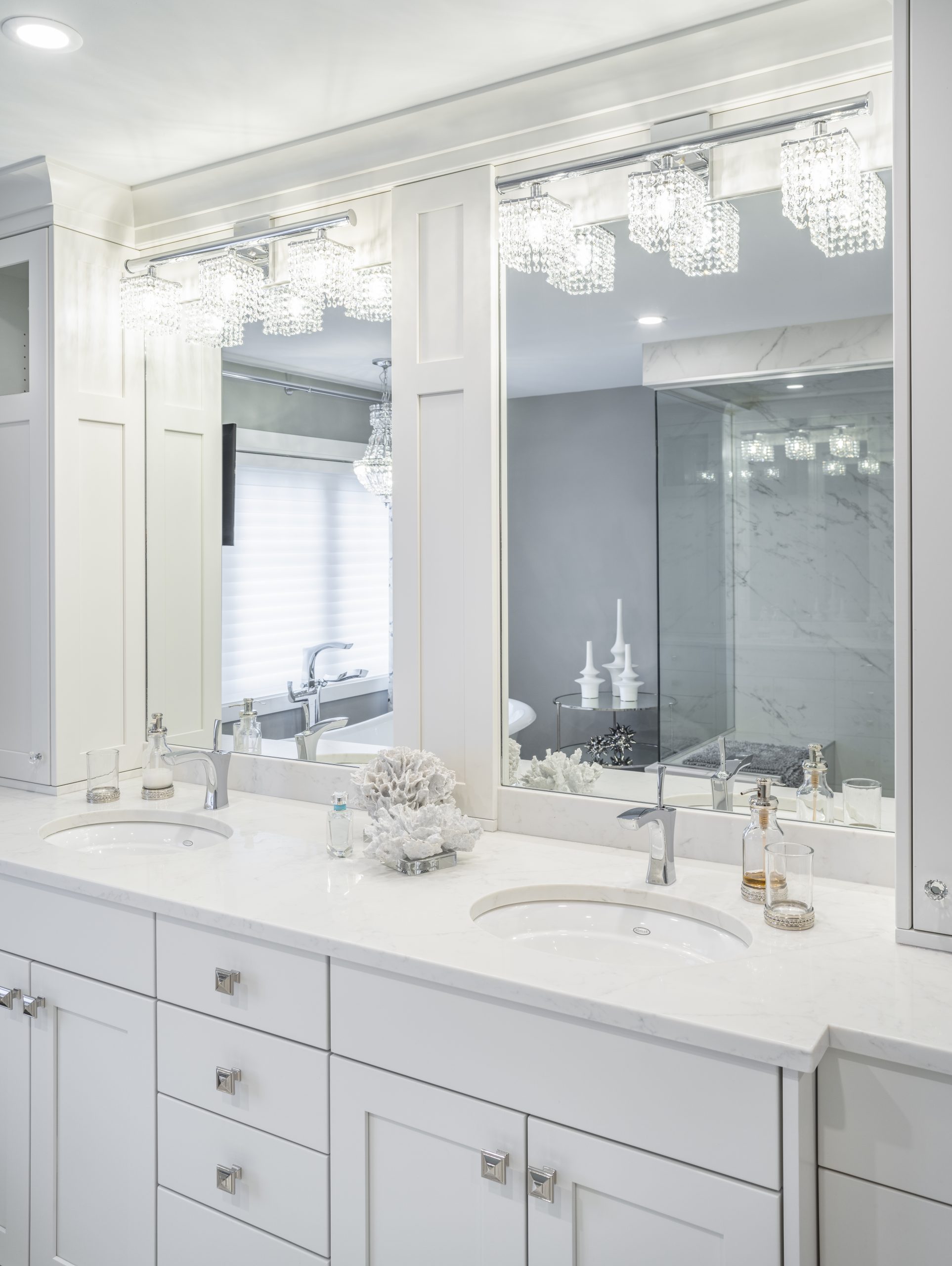 • We used polished nickel details for all the finishes adds sophistication and glamour to this space.