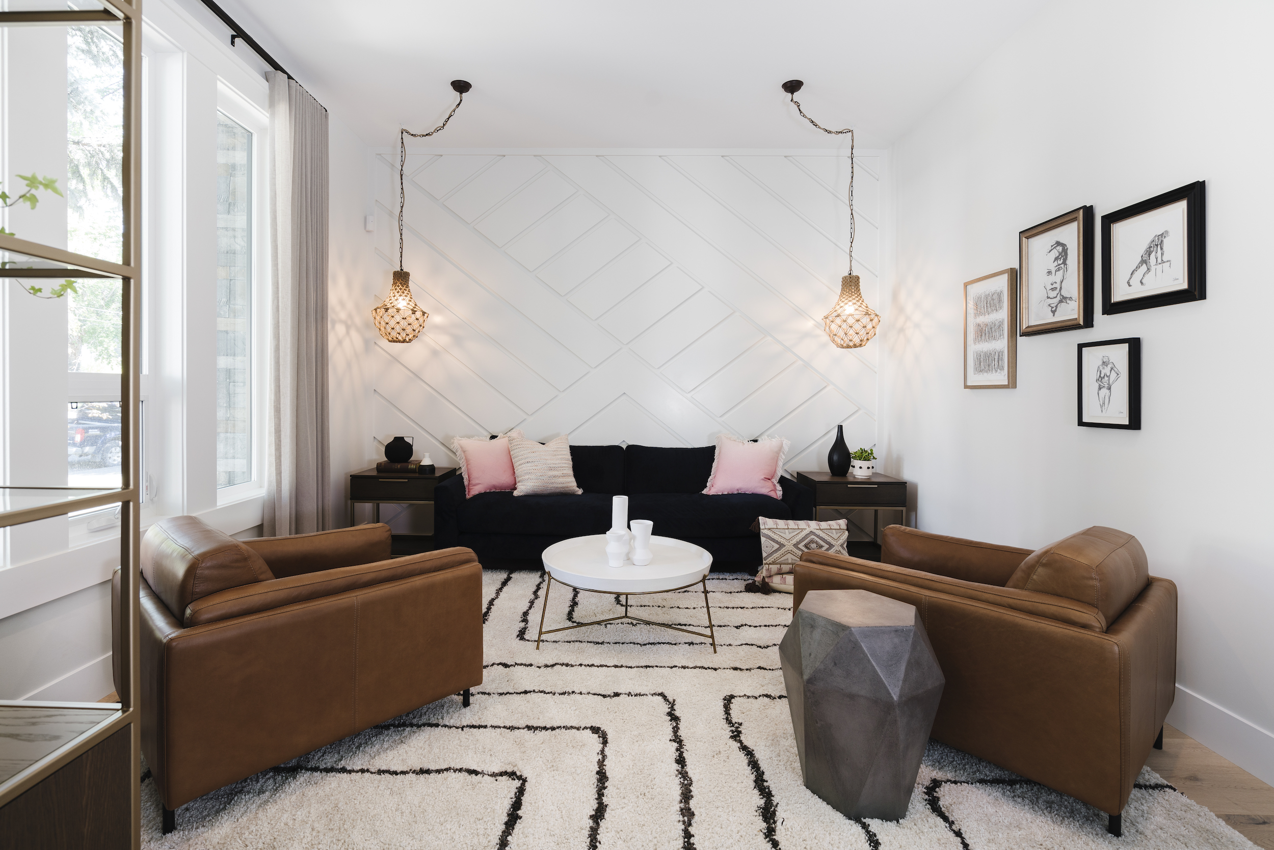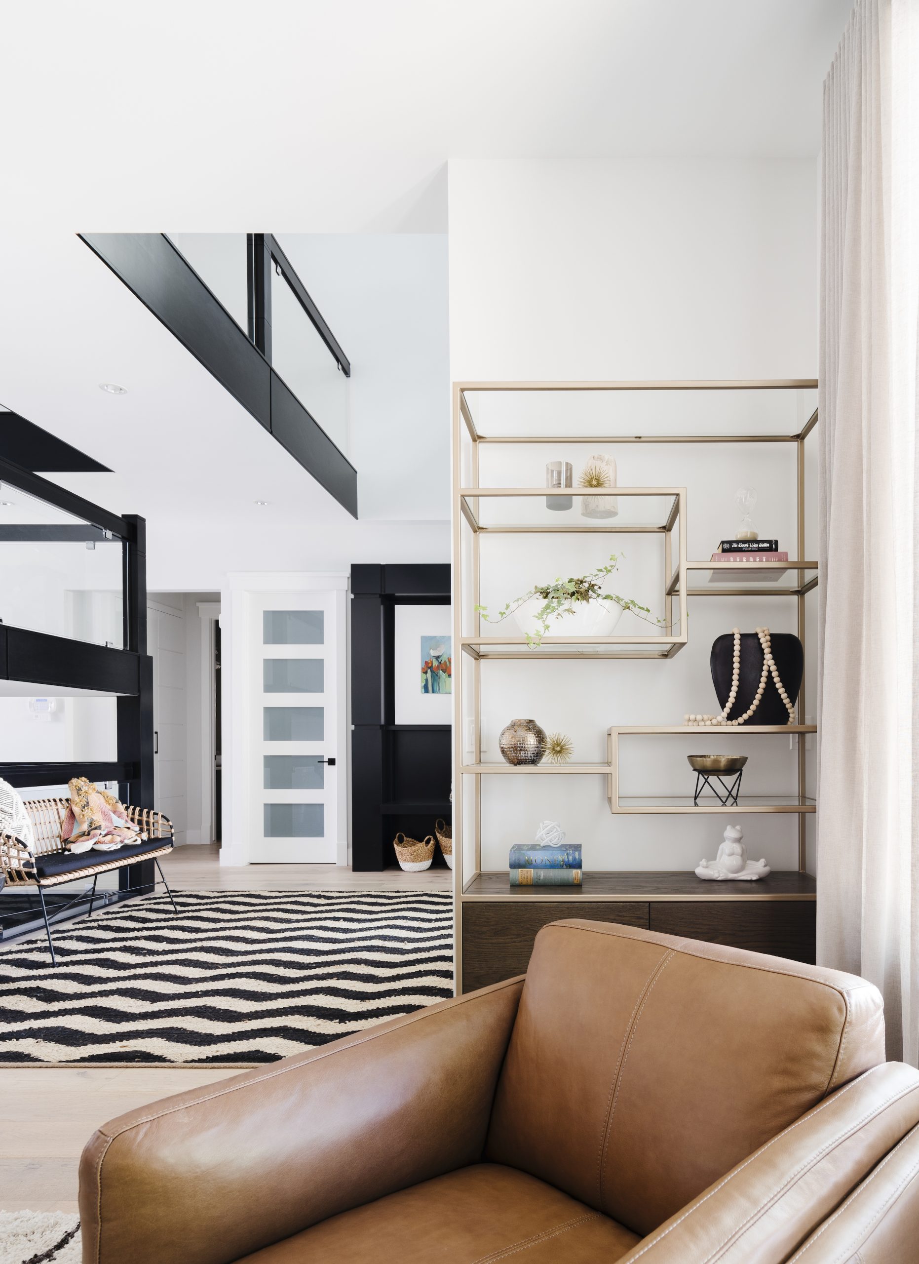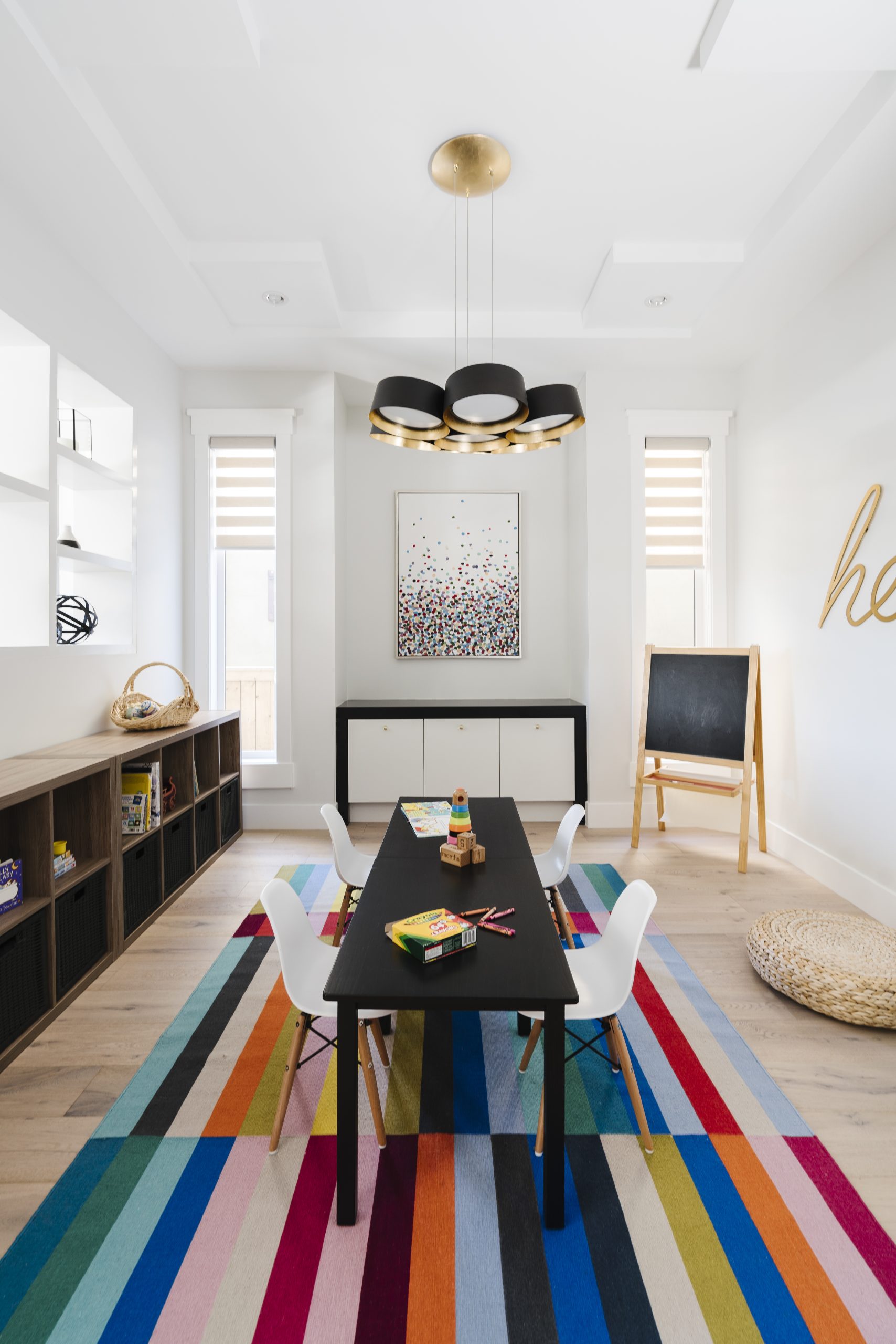 • We furnished the eating area with an extra-large table with a bench seat to accommodate all the kids. The formal dining room was turned into a playroom, so that mom can keep an eye on all four on the main floor when busy prepping meals or working in the office. The custom furnishings in the family room are kid and pet friendly, and we designed 3 upholstered ottomans so the kids could jump, play and hang out on without damaging themselves or the furniture. When the west sun sets in the evening, the custom drapes can be closed to keep out the harsh sunlight. All display items are out of reach of little hands and add visual interest in the space. We created a special room for mom at the front of the home, so she can kick back and relax after a long day. We replaced bright pot lights with hanging fixtures in a woven jute to add warmth and interest. The front entry plays off the boldness of the stairs, using black in the furnishings to anchor the space and add interest to the front entry.